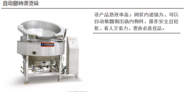 燃气自动翻转漂烫锅采用燃气(液化气、天然气、人工煤气)为能源,独特的燃烧器使燃烧充分、热效率高;内滤锅为网状料斗,可以自动倾翻倒出锅内物料,使得整个操作过程安全且轻松,具有劳动强度小、功效高、便于操作、省人、省力等优点;全不锈钢制造,符合卫生要求,外型造型美观大方,使用方便。