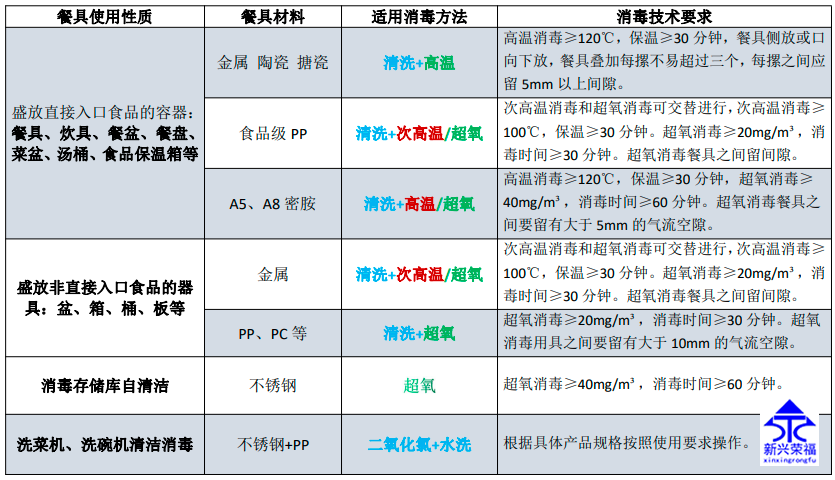 水洗后的餐具达不到卫生标准要求(即便是使用了消毒液后也不能完全杀灭细菌和病毒),还需进行干燥和消毒,目前餐饮行业多采用高温热风循环消毒方法,通过热风循环可将餐具加热到120℃以上,使餐具上残留的细菌和病毒发生蛋白质变质而失去活性,热风消毒库操作简单,对餐具摆放要求相对较低,消毒效率高,适合金属、陶瓷类餐具的高温消毒。 但是也会有些餐具不适合高温消毒,高温情况下发生了严重变形甚至是熔化,因此新兴荣福消毒库增加了超氧消毒的功能。