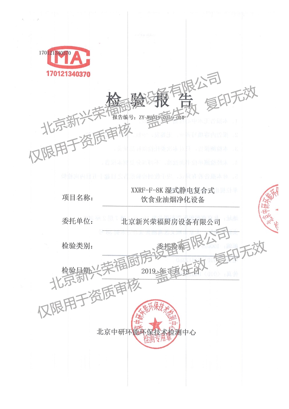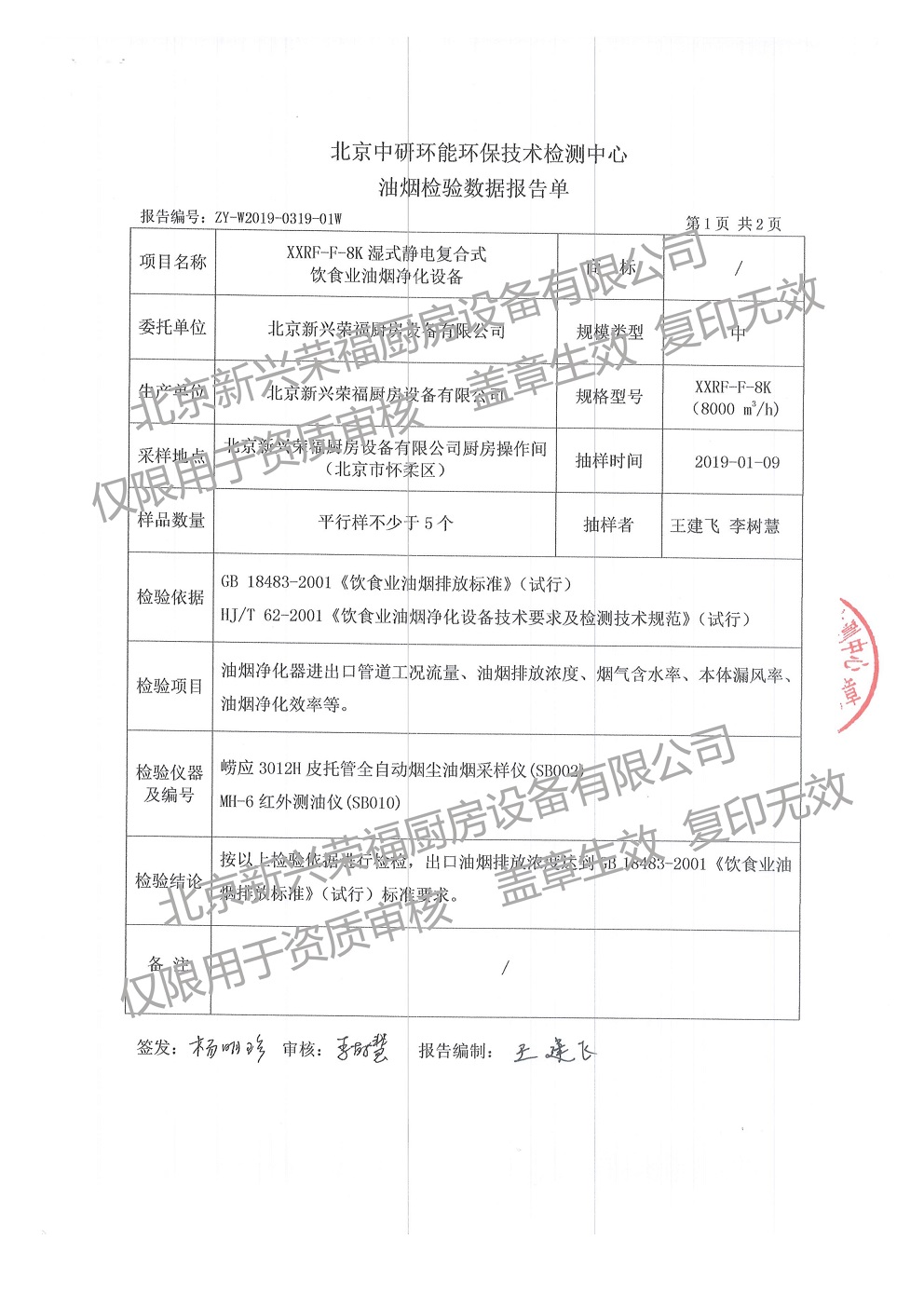 1、净化率高达96%,优于DB11 1488北京地标-餐饮业大气污染物排放标准。经实际使用和第三方检测机构检测结果如下:油烟浓度:0.38mg/m³;颗粒物浓度:1.20mg/m³;非甲烷总烃浓度:2.05mg/m。